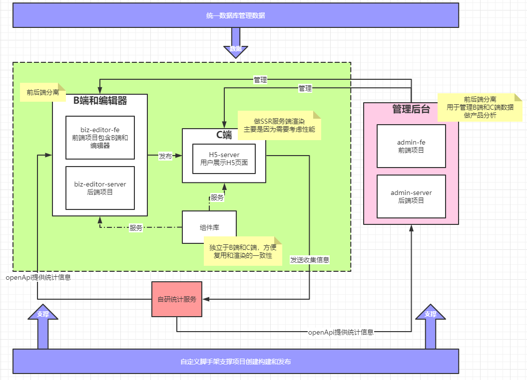 • B端是前后端分离开发,受众不是大众所以不采用SSR模式开发,如果H5的编辑器比较复杂,可以拆分成单独项目进行开发。