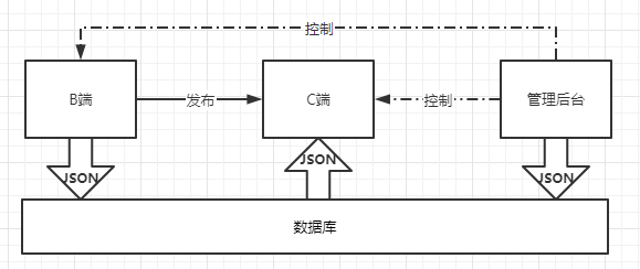 使用统一的数据库管理数据,B端产生组件的配置数据存入数据库并发布项目,C端读取组件配置数据渲染出H5页面供用户访问,管理后台通过管理数据库的数据达到控制B端和C端的目的。